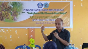 Konsistensi Jurusan Kimia FMIPA Unpatti dalam menjalankan dharma pengabdian kepada masyarakat merupakan perwujudan kontribusi nyata ilmu kimia bagi masyarakat. Pengabdian yang dilaksanakan di Negeri Morella ini berlangsung pada 28 Oktober 2021 dengan mengusung tema besar “Peningkatan Nilai Ekonomis Buah Kelapa”. Dari tema ini, salah satu produk unggulan yang dijadikan bahan pelatihan bagi masyarakat adalah pembuatan Virgin Coconut Oil (VCO) dari bahan baku utama santan kelapa.