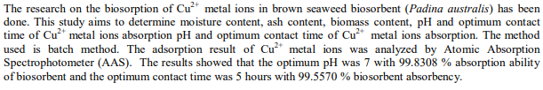 - Biosorpsi ion logam tembaga (Cu2+) pada biosorben rumput laut coklat (Padina australis) (2018)