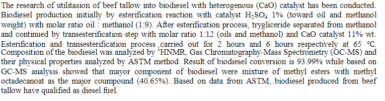 - Application of CaO from Psammotaea elongata Shell as Catalyst in Conversion the Beef Tallow to Biodiesel (2015)