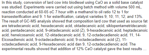 6. Pengolahan lemak sapi menjadi biodiesel dengan katalis Heterogen (2014)