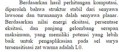 2. Perhitungan komputasi potensi Lawsone dan turunannya sebagai material aktif pada sel surya tersensitisasi zat warna (2019)