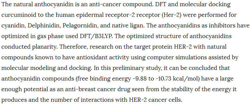 5. DFT and molecular docking investigations anthocyanidin to the human epidermal receptor-2 receptor (HER-2) in breast cancer (2021)