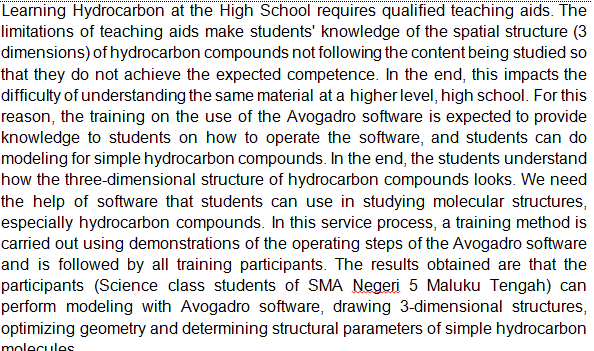 - PENINGKATAN PEMAHAMAN STRUKTUR MOLEKUL SEDERHANA DENGAN PERANGKAT LUNAK AVOGADRO PADA SISWA SMA NEGERI 42 MALUKU TENGAH SECARA ONLINE