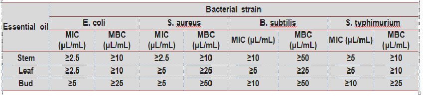Minimum inhibitory concentration (MIC) and minimal bactericide concentration (MBC) of clove oil